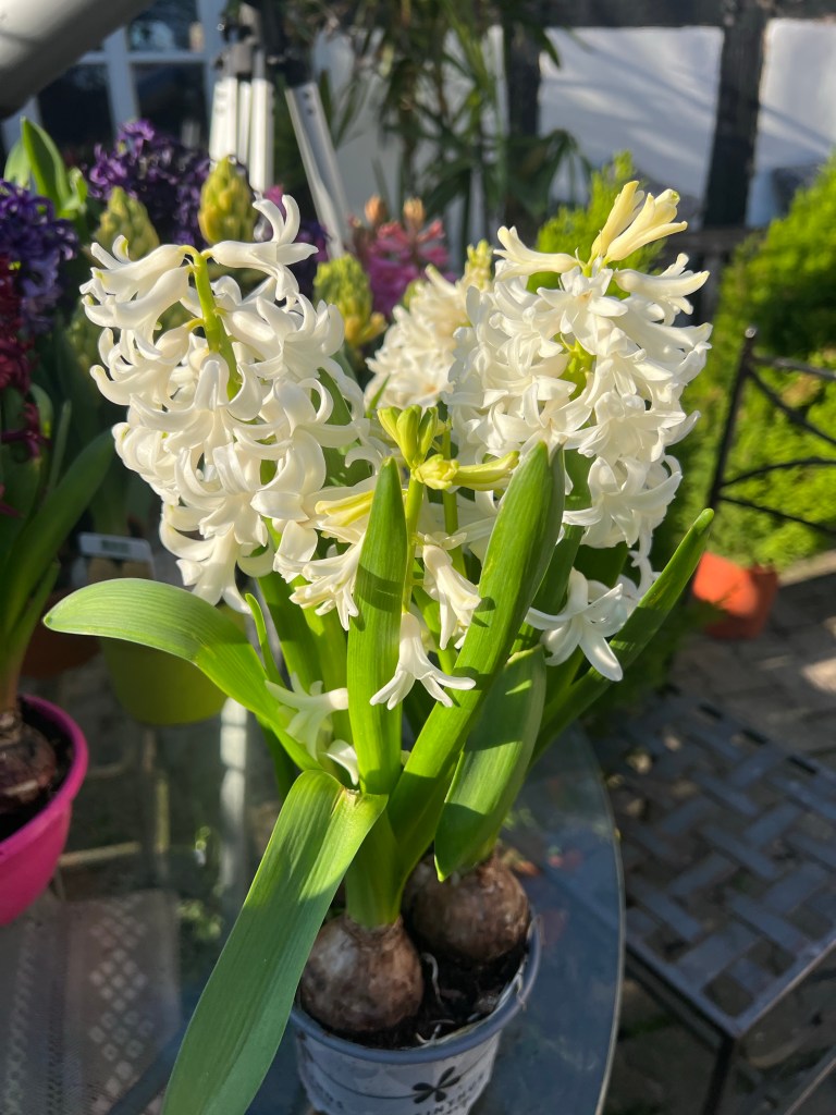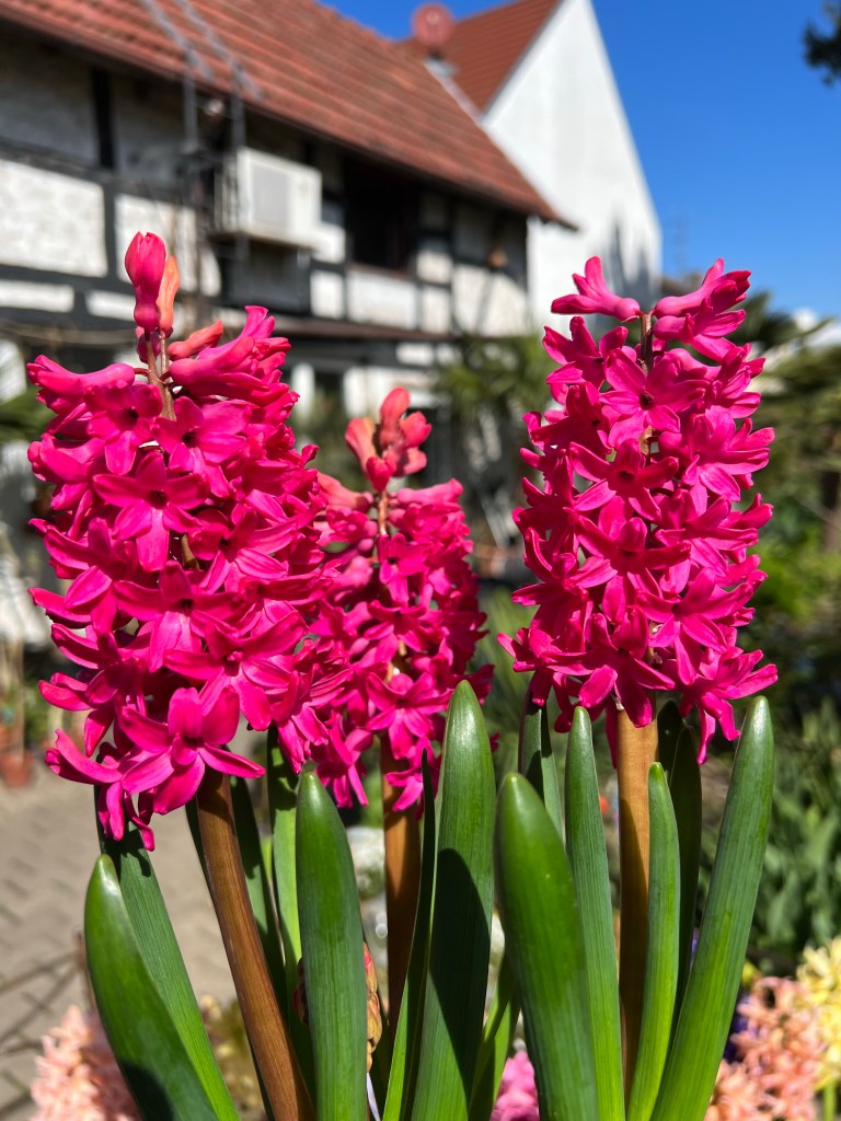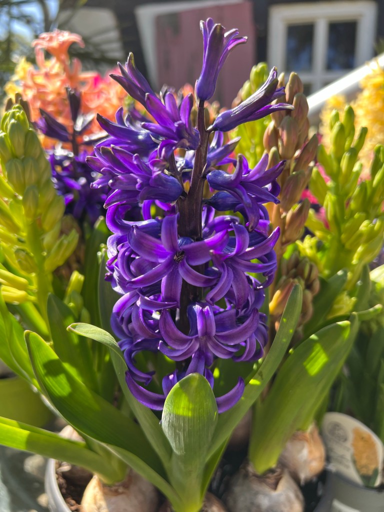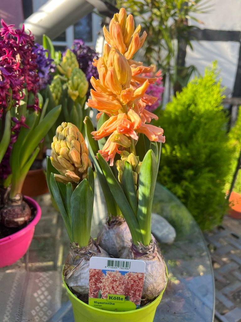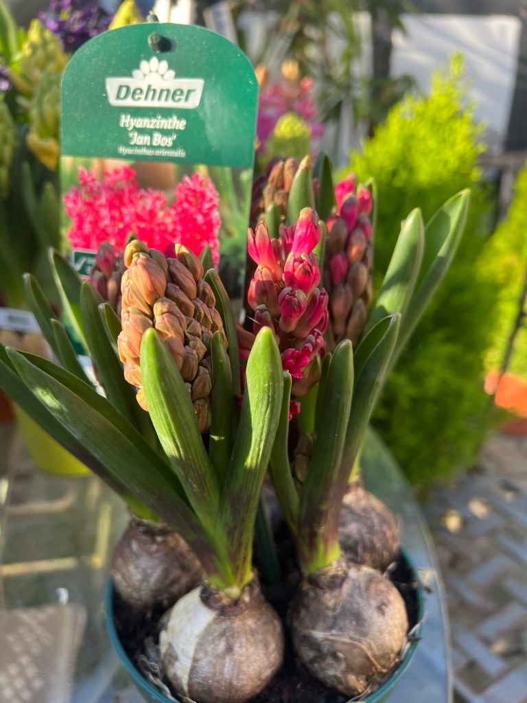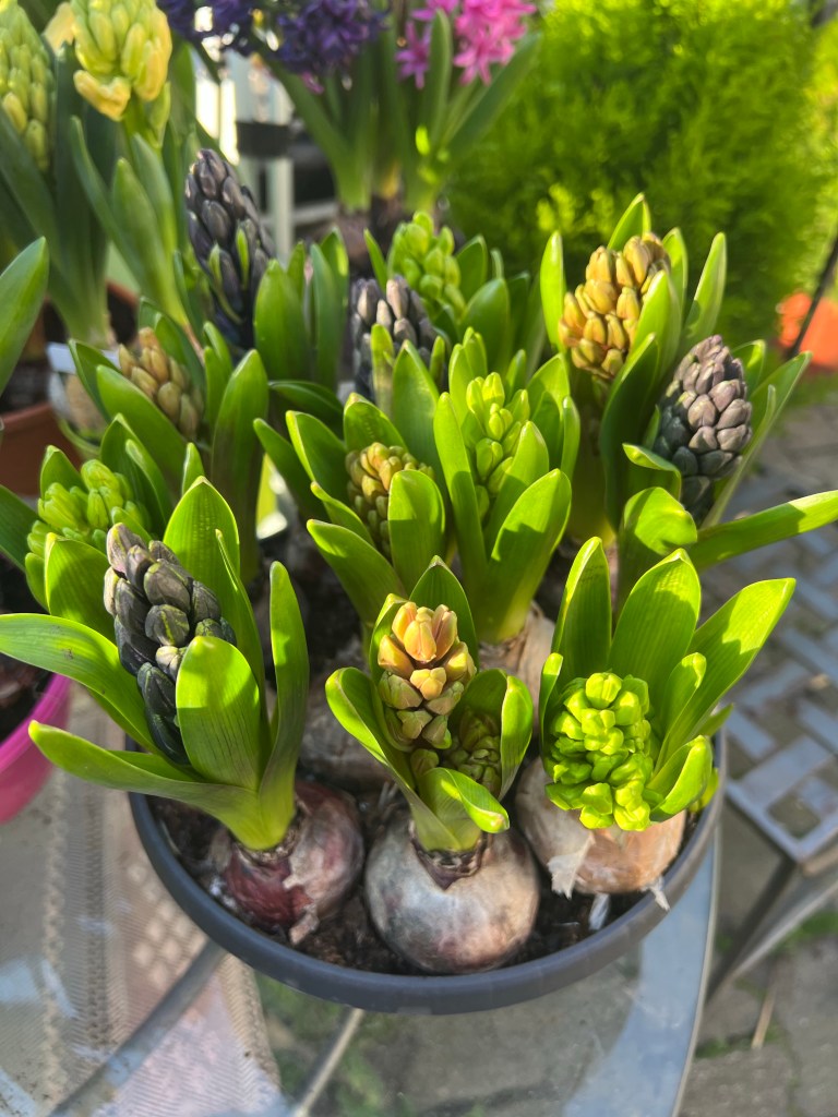 Gegen Ende der Hyazinthensaison findet man in den Gartencentern häufig vielblütige Hyazinthen, die sich mit kleineren Blüten aus einer sich mehrfach geteilten Zwiebel deutlich von den üblichen Hyazinthen unterscheiden. Die Zwiebeln scheinen etwas hinfälliger zu sein, als die Zwiebeln normaler Hyazinthen. Das ist zumindest meine Erfahrung. Aber ihr Auftritt mit den vielen Blüten lohnt einen Versuch immer!