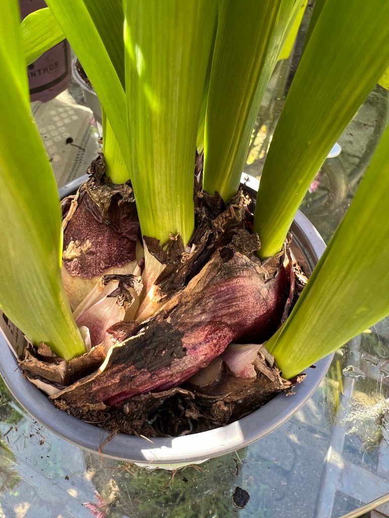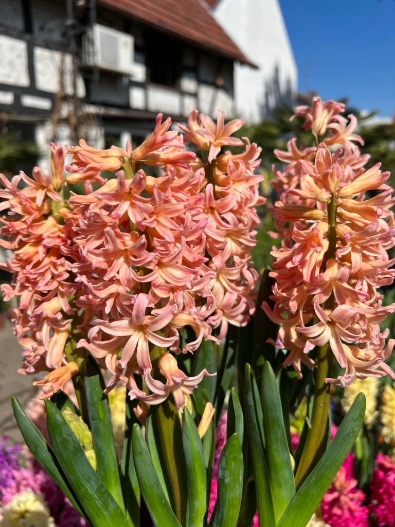 Zuletzt kam nun noch die Farbe Orange dazu, die allerdings treffender durch lachsfarben beschrieben wird. Diese Farbe ist deutlich an dem auffallenden graublauen Blattaustrieb zu erkennen. Die silbrigweißen Zwiebelhäute allein könnten auch auf eine weiße oder gelbe Hyazinthe hindeuten.